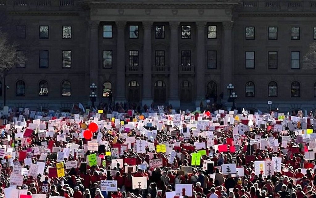 As thousands of striking teachers rallied outside the Alberta Legislature on Thursday, the provincial government maintained Albertans expect spending increases to be held below inflation and to invest wisely in services such as education.